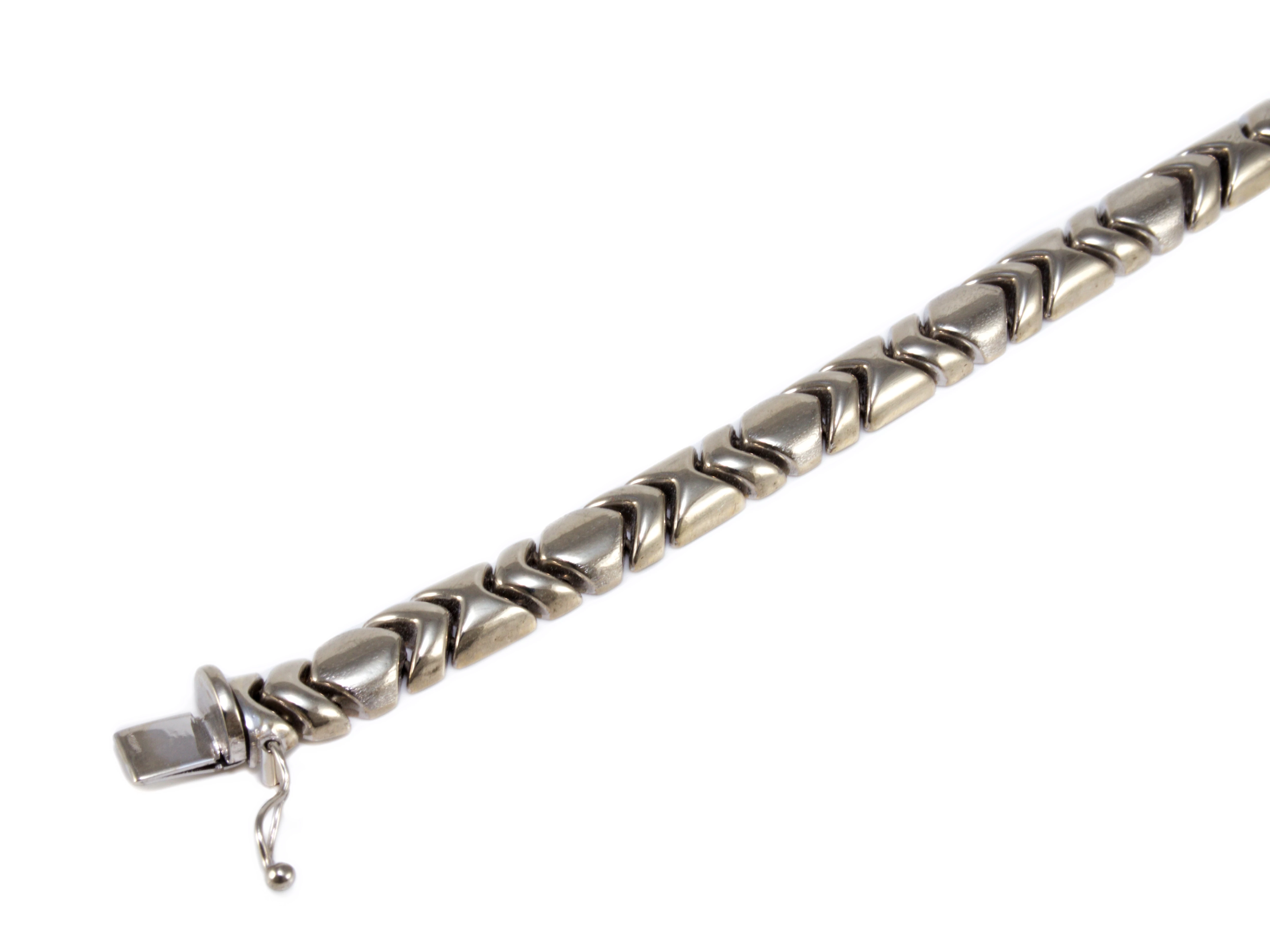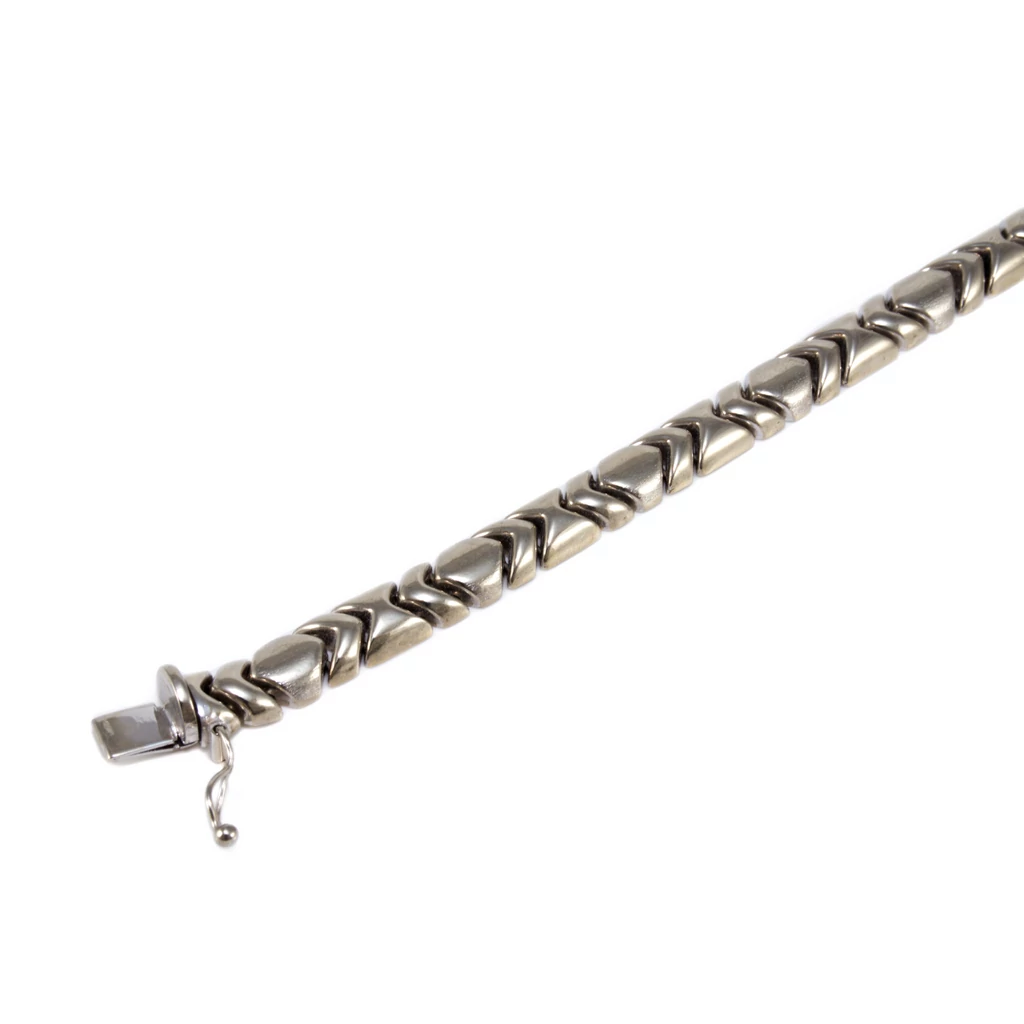 Modern stílusú, kedvelt fazonú, ródiummal bevont, üreges kialakítású, de masszív, stiftes fehérarany karkötő.