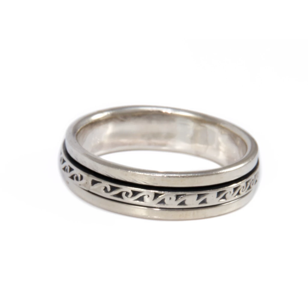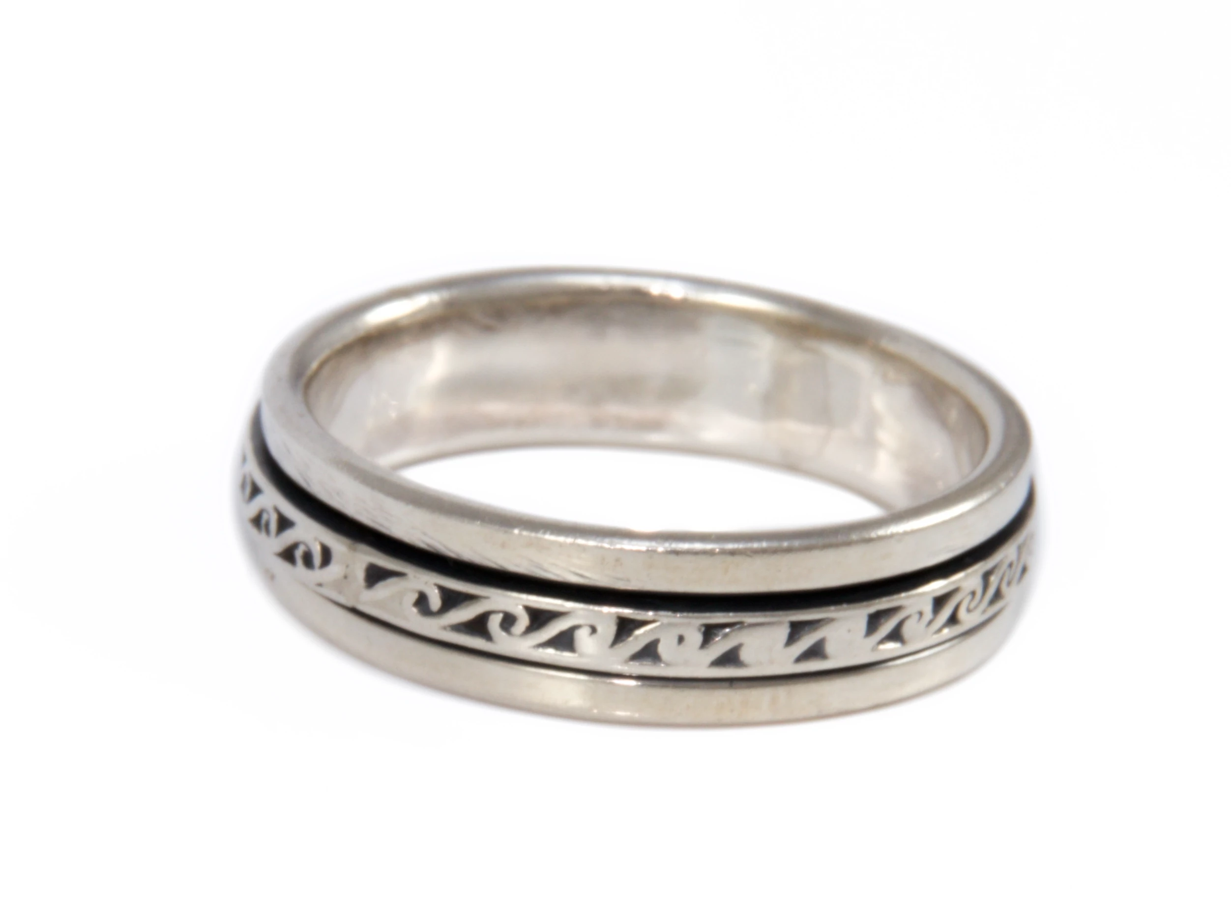 Klasszikus és kedvelt fazonú, antikolással és csiga mintával díszített, széles, középen forgó, stresszoldó ezüst karikagyűrű.