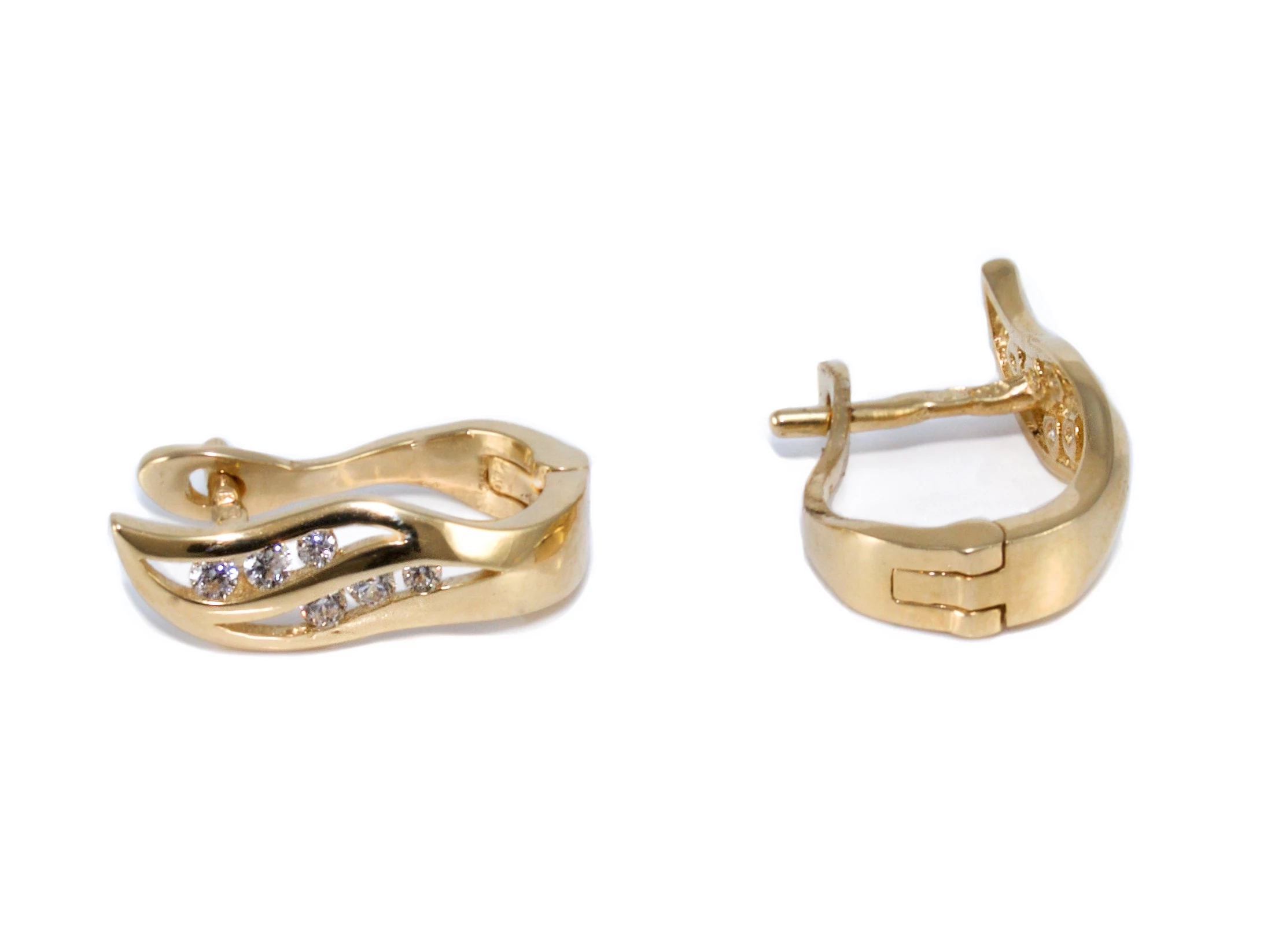 Modern stílusú, hullámos mintával és csillogó cirkónia kövekkel díszített arany fülbevaló.