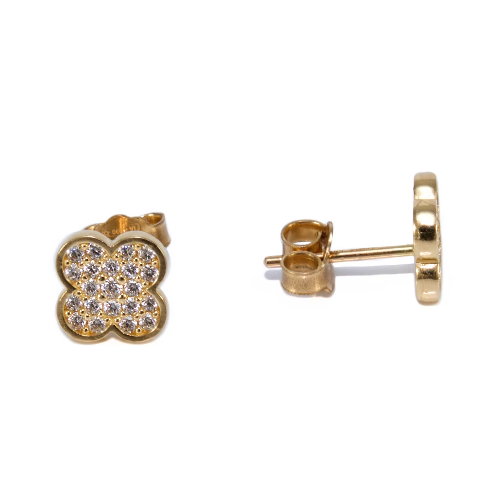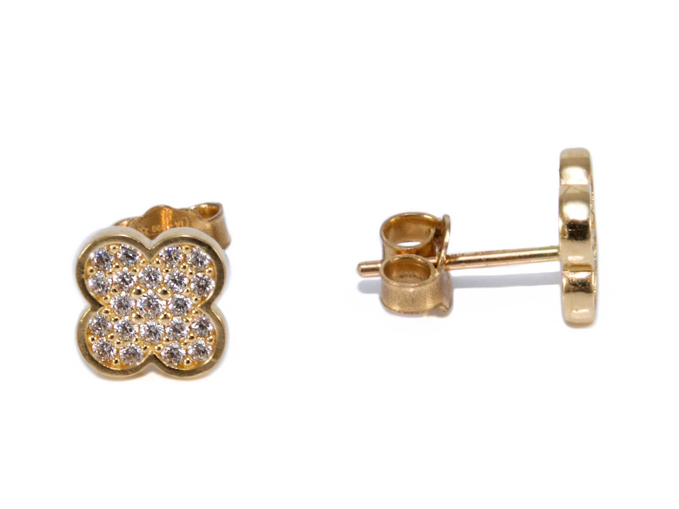 Cirkónia kövekkel ékített virágot ábrázoló, masszív kialakítású bedugós arany fülbevaló.