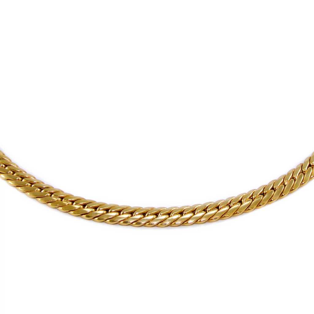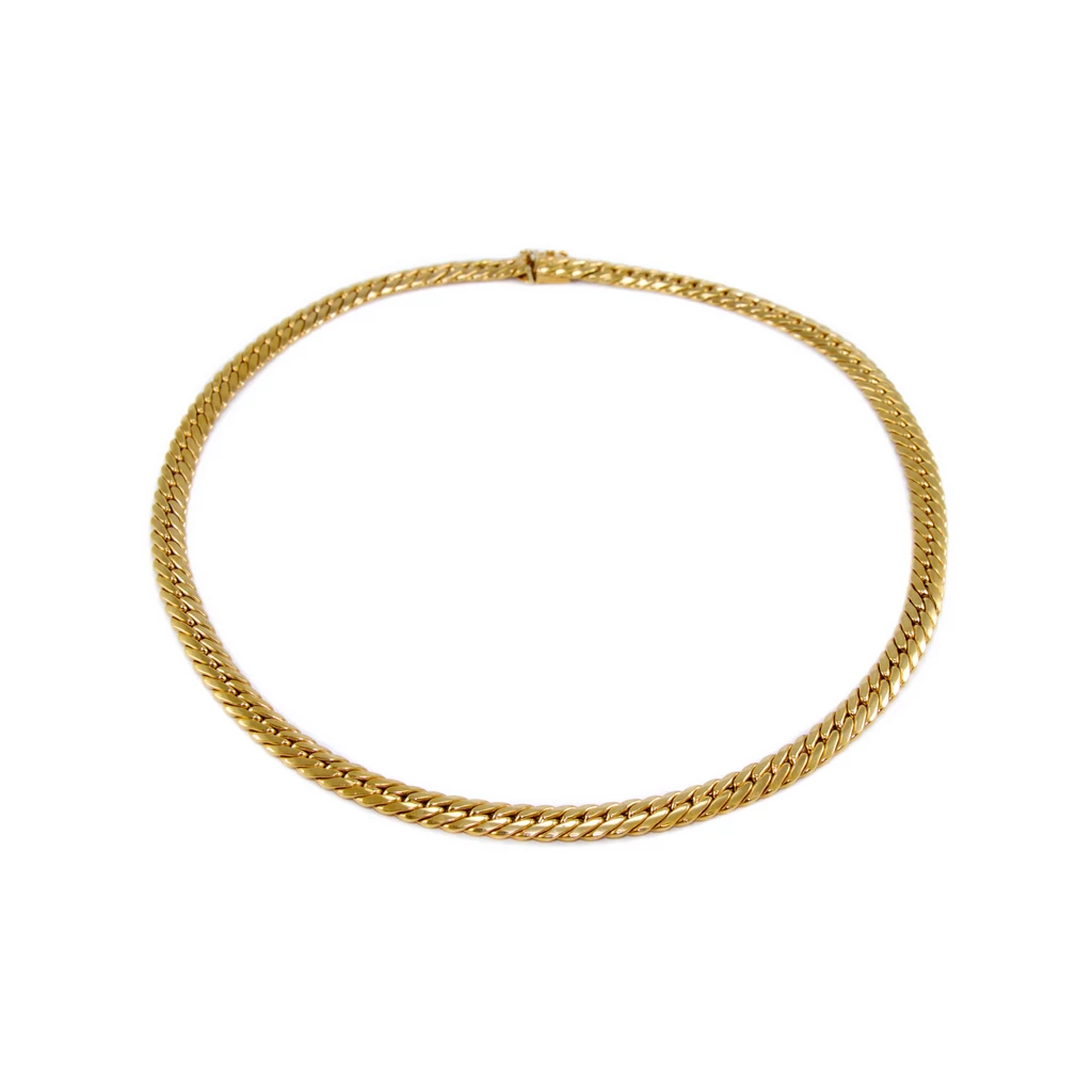 Kedvelt fazonú és igen mutatós a lapított szemezésű, sárga arany "spiga" típusú nyaklánc.