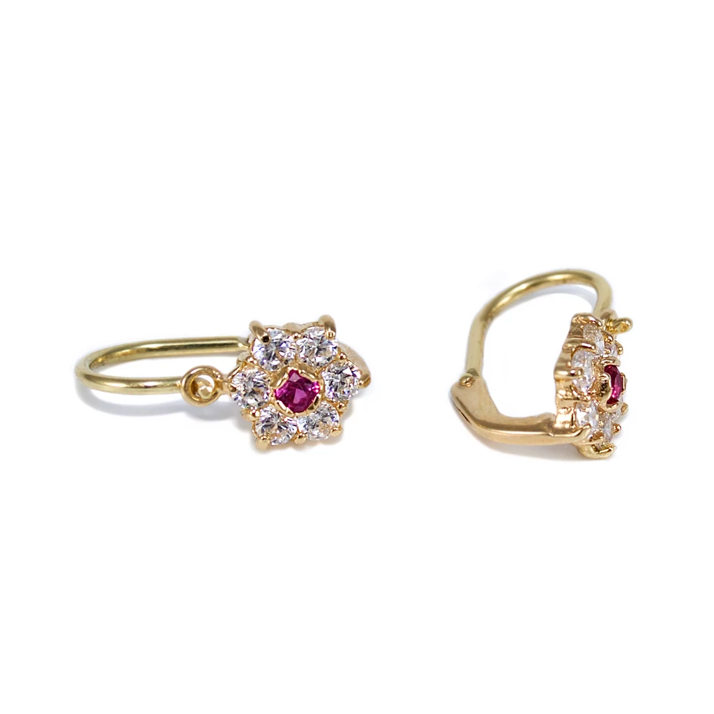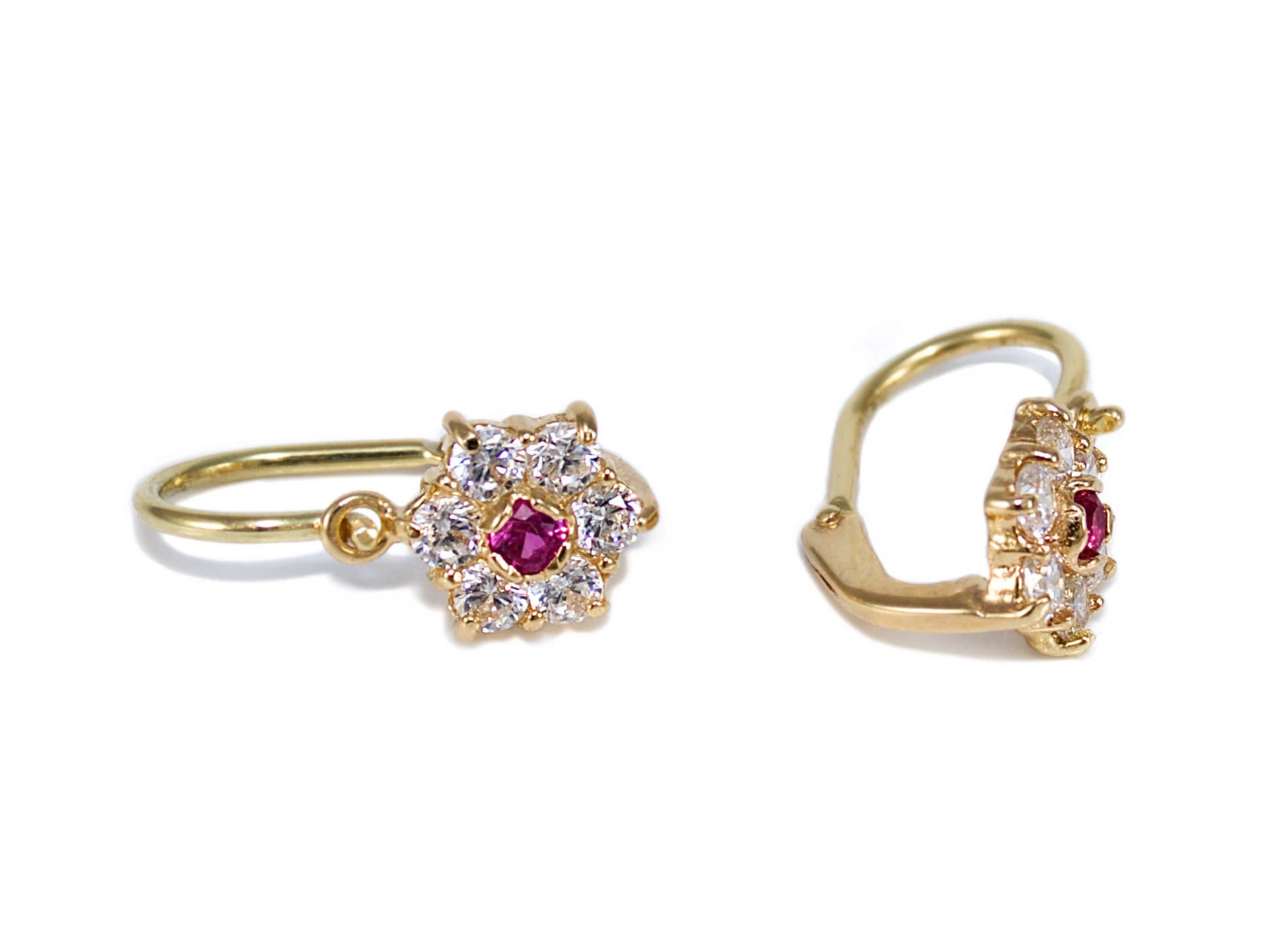 Kedves kis darab, ez a piros műtermékkel, körbe cirkónia kövekkel ékített virágot ábrázoló baba arany fülbevaló.