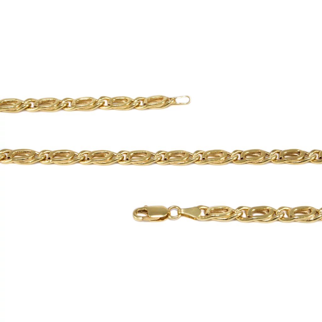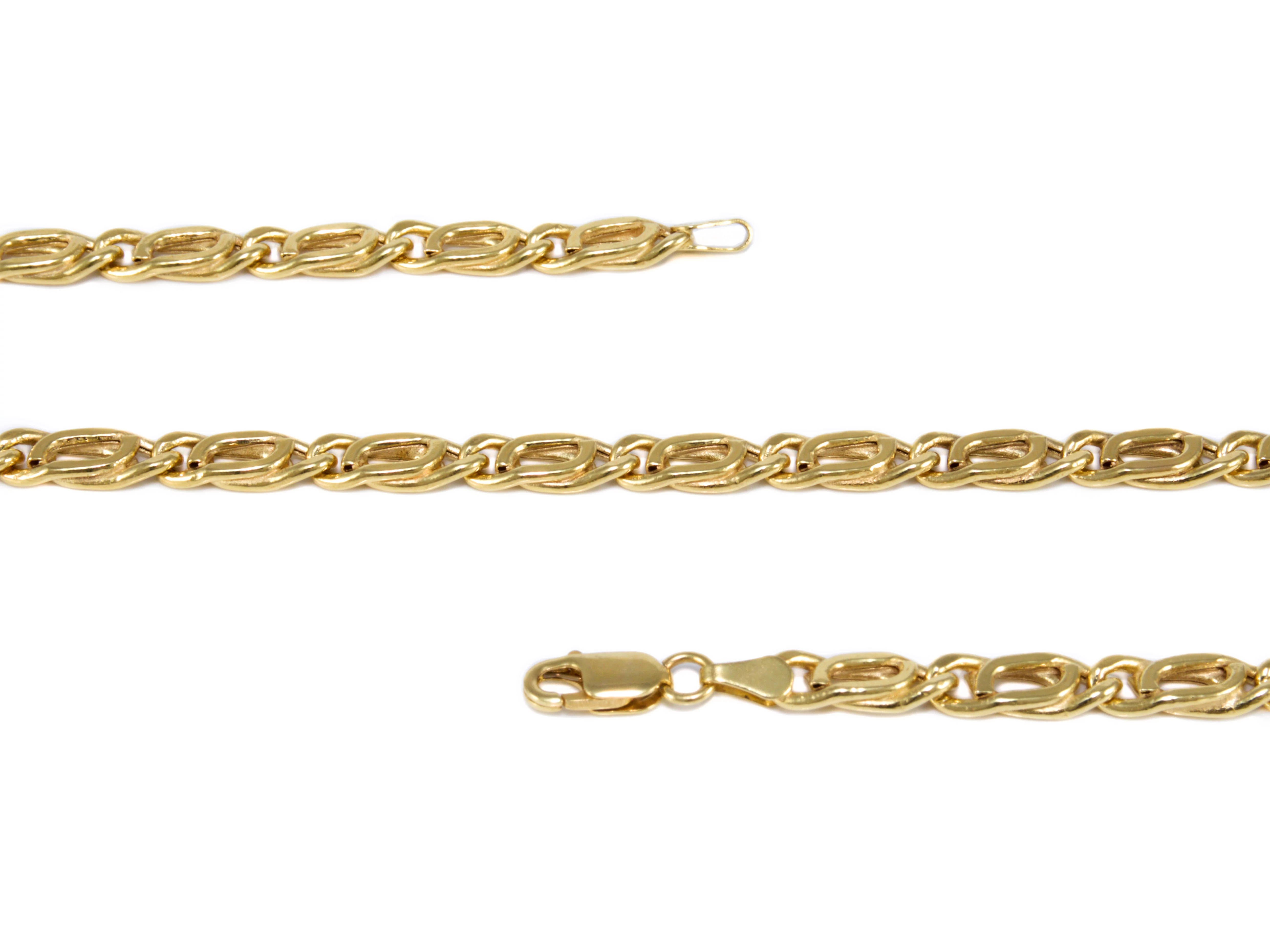 Modern stílusú, kedvelt fazonú, "scharless" típusú fényes, masszív kialakítású aranylánc.