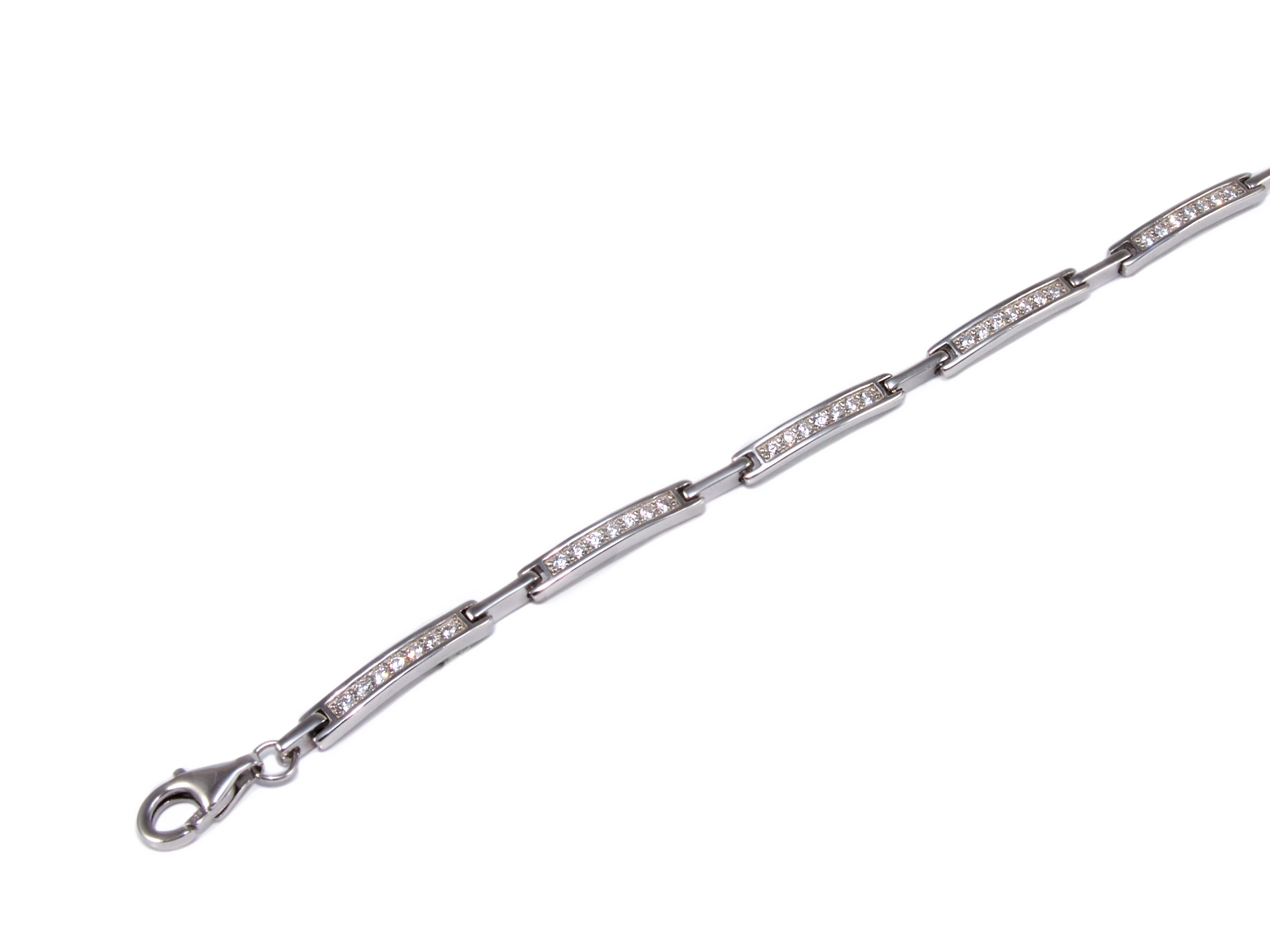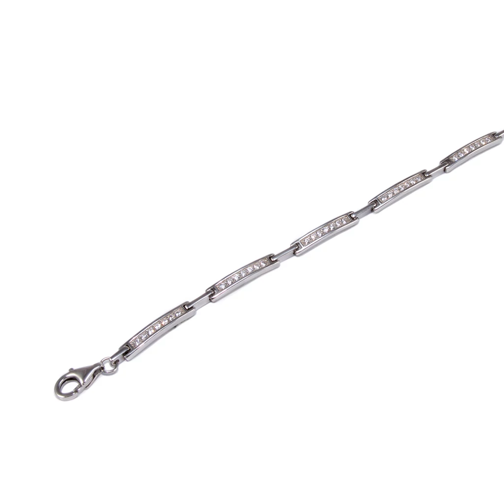 Csillogó cirkónia köves betétekkel kombinált, ródiummal bevont stiftes ezüst karkötő.