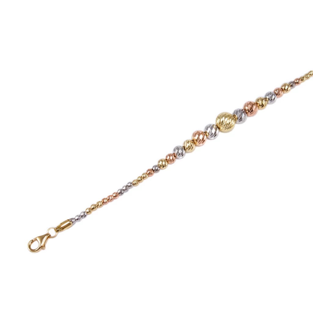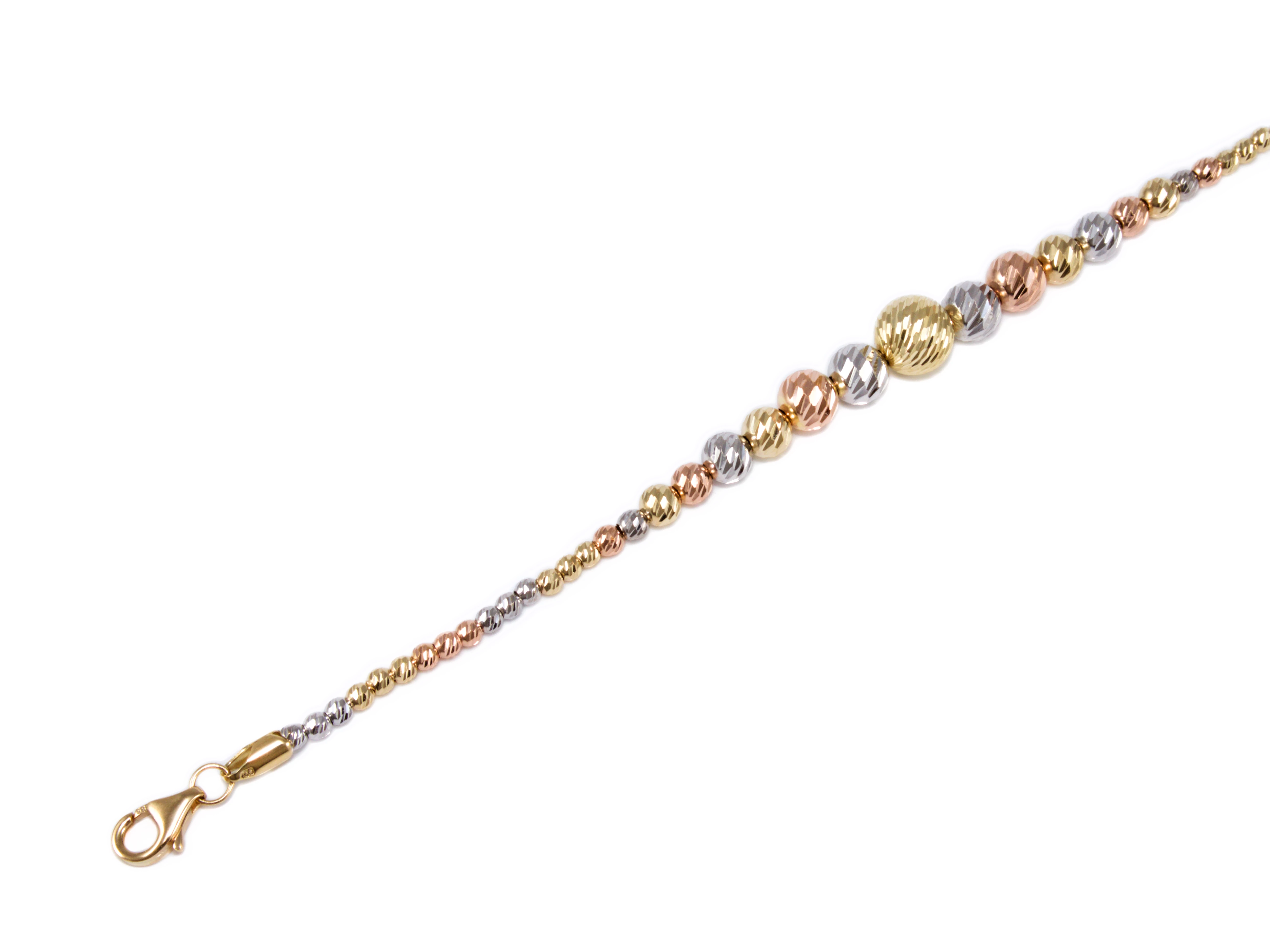 Modern stílusú, kedvelt fazonú, ródiummal és rozé arannyal díszített, üreges kialakítású, vésett bogyós csillogó arany karkötő.