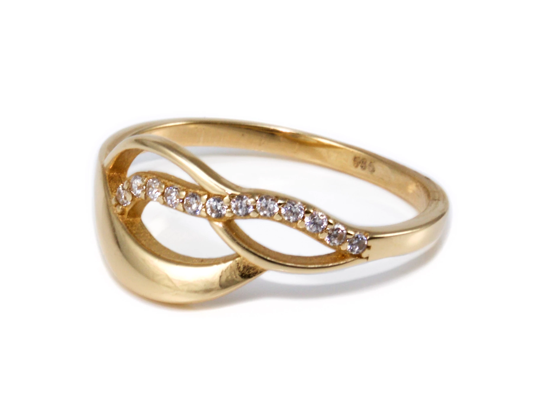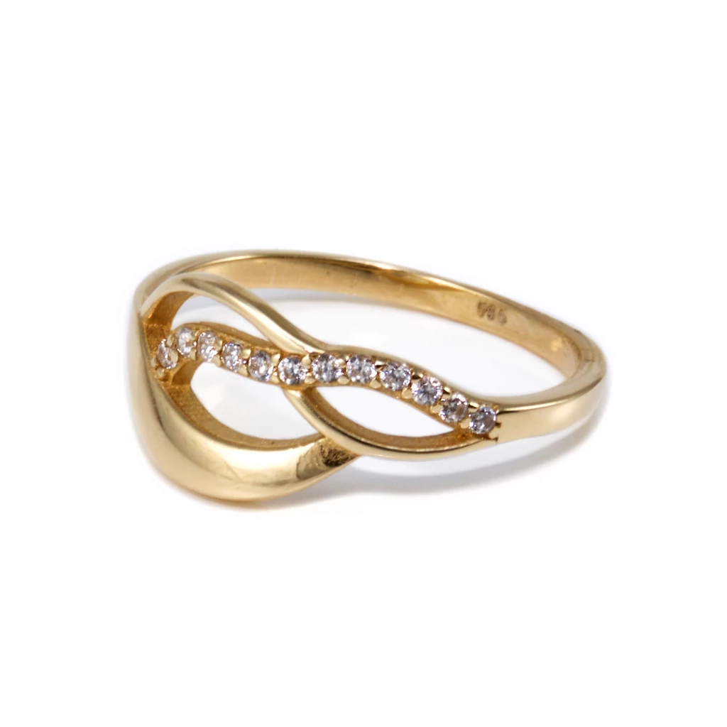 Modern stílusú, kedvelt fazonú, cirkónia kővel ékített, áttört kialakítású, hullámos aranygyűrű.
